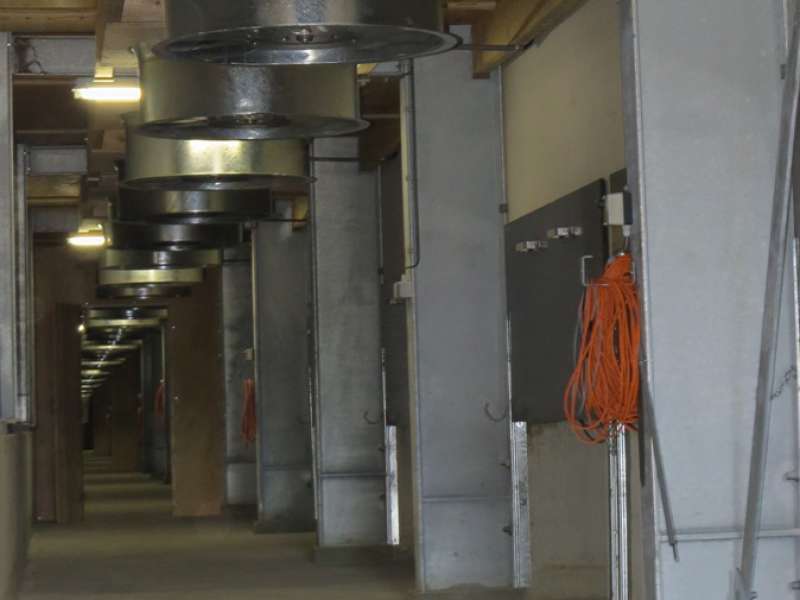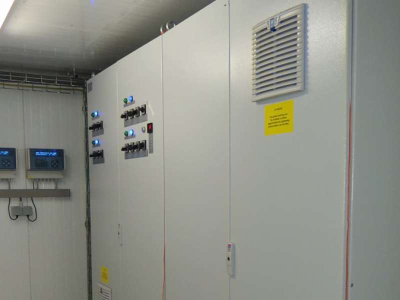 Complete elektrische installatie aardappelbewaarplaats met led verlichting in de bewaarplaats. De complete Tolsma ventilatie installatie is door ons aangesloten en bekabeld. Voedingen voorzien voor de ventilatie en de mechanische koeling; 250A t.b.v. de ventilatie en 250A t.b.v. de mechanische koeling.