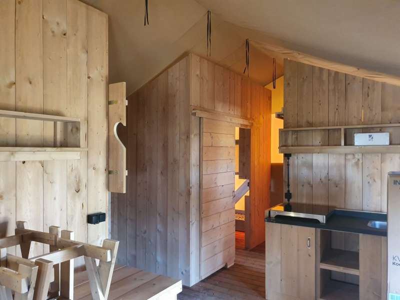 Michelbrink Elektro heeft de elektrische installatie voorzien in de 8 nieuwe Lodge tenten in Vakantiepark Dierenbos van Libéma. In deze tenten zijn de wanden en het interieur gemaakt van steigerhout waarop de elektrische installatie is gemonteerd. Deze tenten zijn in verband met duurzaamheid uitgevoerd met doorstroom boilers, zodat de boiler alléén stroom vraagt bij afname van warm water. De lodges worden op een duurzame manier verwamd met een pellet kachel. Daarnaast zijn ze uitgevoerd met eigen vaatwasser, oven, koelkast, kookplaat en badkamer met toilet en een router ten behoeve van wifi en tv signaal. Om de benodigde stroom bij de lodges te krijgen is een nieuwe veldverdeler verplaats zodat elke lodge kon worden voorzien van een eigen groepenkast.